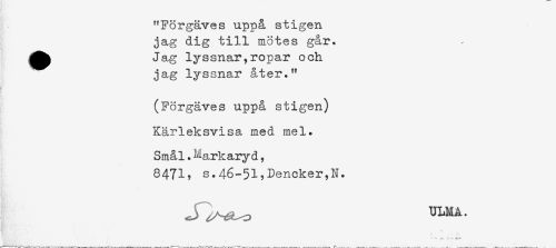 //// "Förgäves uppå stigen //// jag dig till mötes går. //// ^^ Jag lyssnar,ropar och //// jag lyssnar åter." //// (Förgäves uppå stigen) //// Kärleksvisa med mel. //// Smål.Markaryd, //// 8471, s.46-51,Dencker,N. //// Jl^a^ ULMA. //// t. r- ^ ***** ////