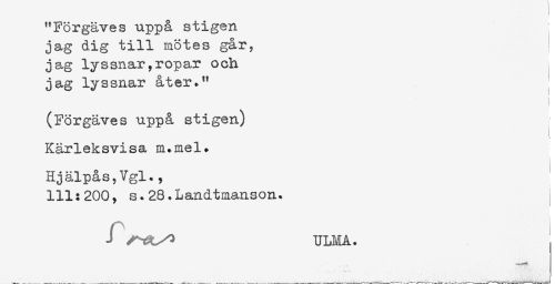 //// "Förgäves uppå stigen //// jag dig till mötes går, //// jag lyssnar,ropar och //// jag lyssnar åter." //// (Förgäves uppå stigen) //// Kärleksvisa m.mel. //// Hjälpås,Vgl., //// 111:200, s.28.Landtmanson. //// J ULM A. ////