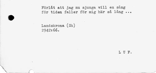 //// Förlåt att jag nu sjunga vill en sång //// för tiden faller för mig här så lång ... //// Landskrona (Sk) //// 2942:66. //// L U F. //// \ r... ...... _ . ////