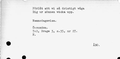 //// Förlåt att vi så dristigt våga //// Dig ur sömnen väcka upp. //// Namnsdagsvisa. //// Ö:sundom. //// 7:2, Brage 3, s-35, M* 27* //// N. //// < //// } ////