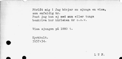 //// Förlåt mig I Jag börjar nu sjunga en visa, //// som enfaldig är. //// Fast jag kan ej med mun eller tunga //// beskriva hur kärleken är o.s.v. //// Visa sjungen på 1880 t. //// Kyrkhult. //// ^ 3157:34. //// L U F. ////