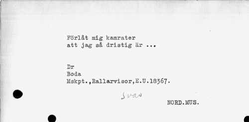 //// Förlåt mig kamrater //// att jag så dristig är ... //// Dr //// Boda //// Mskpt.,Rallarvi sor,E.U.183 67. //// ^ ^ NORD.MUS. ////