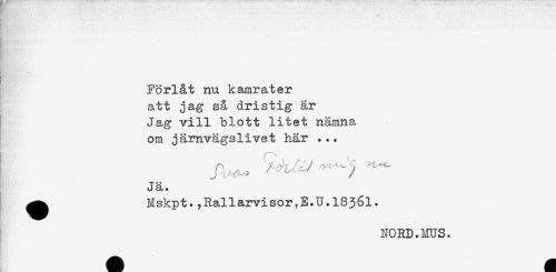 //// t' //// ! //// Förlåt nu kamrater //// att jag så dristig är //// Jag vill blott litet nämna //// om järnvägslivet här ... //// . //// Jä. //// ^ Mskpt.,Rallarvisor,E.U.1836l. //// NORD.MUS. ////