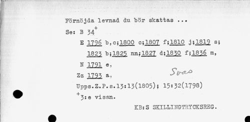//// ^ . . ' - . - - - //// I Förnöjda levnad du bör skattas ... //// Se: B 34* //// E 1796 b,c;1800 c; 1807 f;1810 .1;1819 s; //// 1823 b;1825 nn;1827 d;1830 f;1836 m, //// N 1IR1 e, //// Zz 1795 a. //// Upps.Z.P.s.13:13(1805); 15:32(1798) //// ^^ visan. //// KB:S SKILLINGTRYCKSREG. ////