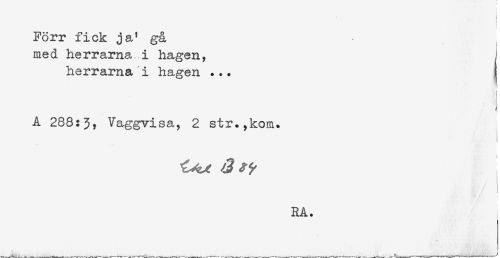 //// j //// Förr fick ja' gå ^ //// med herrarna i hagen, j //// herrarna i hagen ... //// ! //// < //// ! //// ^ j //// A 288:3, Vaggvisa, 2 str.,kom. //// ' I //// < //// RA. ////