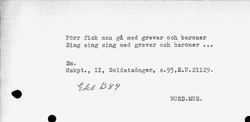 //// Förr fick man gå med grevar och baroner //// Sing sing sing med grevar och baroner ... //// Sm. //// Mskpt., II, Soldatsånger, s.95,E.U.21129. //// * NORD.MUS. //// B*" ////