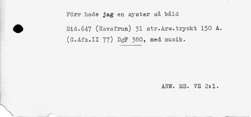 //// Förr hade jag en syster så båld //// * //// ^ Sid.647 (Havsfrun) 31 str.Arw.tryckt 150 A. //// (G.Afz.II 77) DgF 380, med musik. //// #.. . -- //// ARW. MS. VS 2:1. //// \ ////