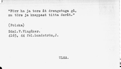 //// "Förr ha ja tors åt drengstuga gå, ! //// nu törs ja knappast titta deråt." //// i //// (Polska) //// Sdml.V.Vingåker. //// 4165y 44 fol.Lundström,J. //// i //// ULi^. //// L //// ^ L ////