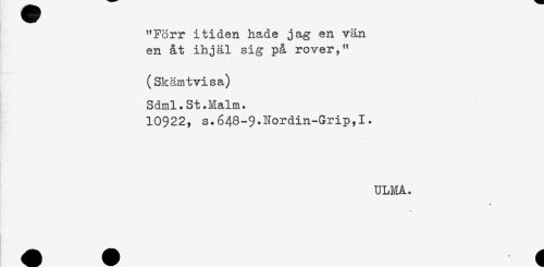 //// "Förr i tiden hade jag en vän //// en åt ihjäl sig på rover," //// (Skämtvisa) //// Sdml.St.Malm. //// 10922, s.648-9*Nordin-Grip,I. //// ULMA. //// * ////