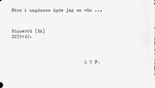 //// Förr i ungdomen ägde jag en vän ..* //// . //// Högseröd. (Sk) //// 2259:42. //// å //// < //// L U F. i //// ! ////