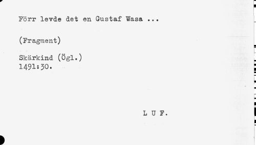 //// Förr levde det en Gustaf Wasa ... //// (Fragment) //// Skärkind (Ögl.) ^ //// 1491:30. ^ //// ! //// L U F. j //// ! //// i //// < ////