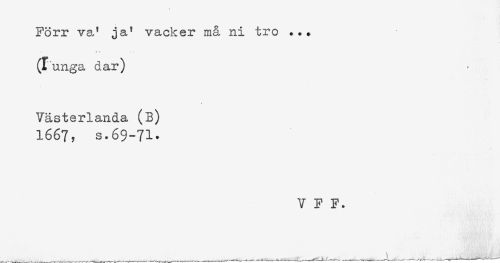 //// Förr ve/ ja' vacker må ni tro ... //// (Lunga dar) //// Västerlanda (B) //// 1667, s.69-71* //// V F F. ////