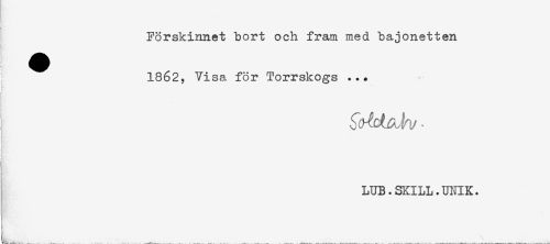 //// Förskinnet bort och fram med bajonetten //// 1862, Visa för Torrskogs ... //// - //// < //// . //// LUB.SKILL.UinK. ////