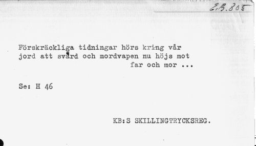 //// Förskräckliga tidningar hörs kring vår //// jord att svård och mordvapen nu höjs mot //// far och mor ... //// Se: H 46 //// i //// : //// KB:S SKILLINGTRYCKSREG. ////