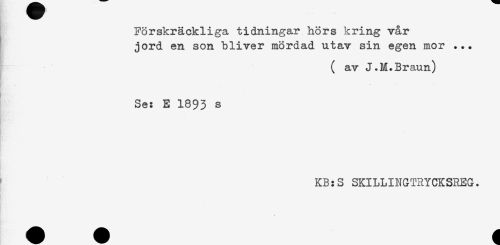//// Förskräckliga tidningar hörs kring vår //// jord en son bliver mördad utav sin egen mor ... //// ( av J.M.Braun) //// ) //// Se: E 1893 s //// pr //// . //// KB:S SKILLINGTRYCKSREG. ////