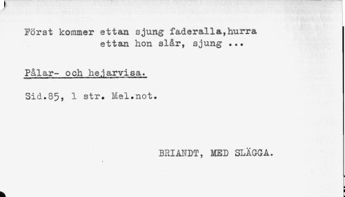 //// Först kommer ettan sjung faderalla,hurra //// ettan hon slår, sjung ... //// Pålar- och hejarvisa. //// Sid.85, 1 str. Mel.not. //// BRIANDT, MED SLÄGGA. //// ^ ! ////