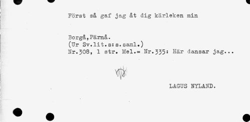 //// Först så gaf jag åt dig kärleken min //// ' - ' ' - //// Borgå,Pärnå. //// (Ur Sv.lit.s:s*saml.) //// Nr.308, 1 str. Mel.= Nr.335: Här dansar jag... //// <. //// t //// * //// ! - //// LAGUS NYLAND. ////
