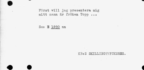 //// Först vill jag presentera mig //// mitt namn är fröken Topp ..* //// ; //// Se: E 1890 nn //// * //// * //// * //// KB:S SKILLINGTRYCKSREG. //// * . - * . . ////