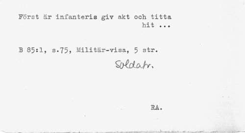 //// Först är infanteris giv akt och titta //// hit ... //// B 85:1, s.75, Militär-visa, 5 str. //// * . //// RA. ////