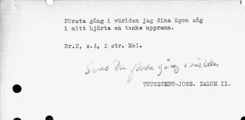 //// Första gång i världen jag dina ögon såg //// i mitt hjärta en tanke upprann. //// Nr.2, s.4, 2 str. Mel. //// ^ THUNSTEDT-JOBS. DALOM II. ////
