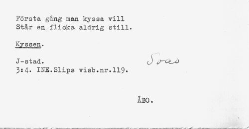 //// Första gång man kyssa vill //// Står en flicka aldrig still. //// Kyssen. //// J-stad. (,) ^t^J //// 3:4- INE.Slips visb.nr.119. //// ÅBO. ////