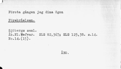 //// Första gången jag dina ögon //// Förebråelsen. //// Sjöbergs saml. //// Åb.Nl.Wefvar. SLS 82,367; SLS 125^33. s.14. //// No.14.(15). //// . k- //// ÅBO. ! ////