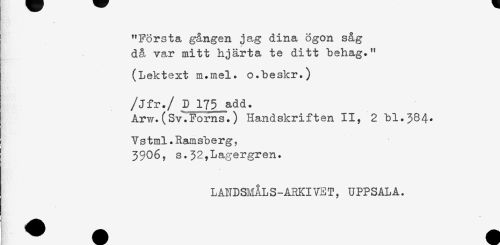 //// } "Första gången jag dina ögon såg //// då var mitt hjärta te ditt behag." //// (Lektext m.mel. o.beskr.) //// /Jfr./ D 175 add. //// Arw.(Sv.Forns.) Handskriften II, 2 bl.384. //// Vstml.Ramsberg, //// 3306, s.32,Lagergren. //// LANDSMÅLS-ARKIVET, UPPSALA. ////