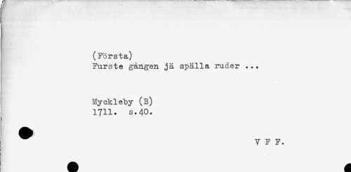 //// ET .: * //// (Första) //// Furste gängen jä spälla ruder ... //// Nan?*'- ' //// ! Myckleby (B) //// 1711. s.40. //// t //// ^ V F F. ////