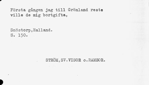 //// Första gången jag till Grönland reste //// ville de mig bortgifta, //// Snöstorp,Halland. //// s. 150. //// STRÖM,SV.VISOR o.RAMSOR. //// * * j ////