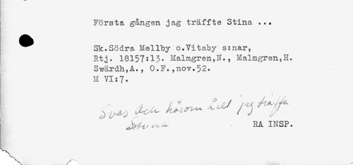 //// ! Första gången jag träffte Stina ... //// i ^^ Sk.Södra Mellby o.Vitaby s:nar, //// Rtj. 18157:13. MalmgrenJL, Malmgren,H. //// Sv^ärdh,A., O.F.,nov.52. //// M VI:7. //// ^ ^ ^ ^^ / ^ ^^ //// RAINSP. ////