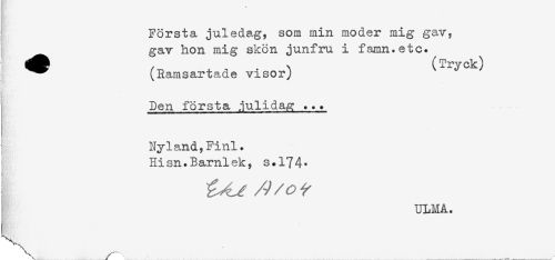 //// Första juledag? som min moder mig gav, //// gav hon mig skön junfru i famn.etc. //// (Ramsartade visor) ^ i*jck) //// Den första julidag ... //// t //// Nyland,Fini. //// Hisn.Barnlek, s.174' //// ULMA. //// k //// \ ____ ////
