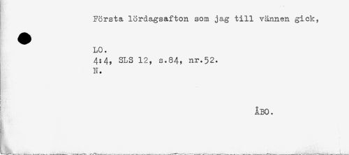 //// R; //// Första lördagsafton som jag till vännen gick, //// ^ LO. //// 4:4, SLS 12, s.84, nr.52. //// N. //// ÅBO. ////