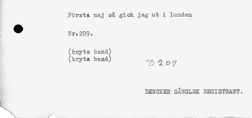 //// Första maj s& gick jag ut i lunden //// ^ Nr.209. //// k //// (knyta band) //// (bryta band) //// DENCKER SÅNGLEK REGISTRANT. //// - - * - * ^ r ////