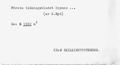 //// Första tidningsbladet öppnas ... //// (av G.Ryd) //// Se: E 1902 n^ //// KB:S SKILLINGTRYCKSHEG. ////