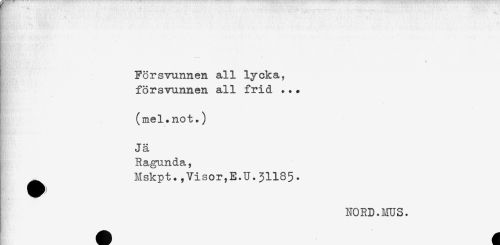 //// t' //// K'' - //// Försvunnen all lycka, //// försvunnen all frid ... //// } //// (mel.not.) //// Jä //// Ragunda, //// ^ Hskpt.,Visor,E.U.31185. //// NORD.MUS. ////