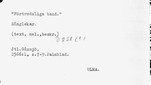 //// "Förtrodeliga band." //// Sånglekar. h //// (text, mel.,beskr.) - //// Jtl.&åxsjö, S //// 2566:1, s.7-9-Palmblad. E //// ULMA. ! //// B //// < //// ^ * ! ////