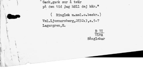 //// I \ på den tid jag höll dej kär." //// ( Ringlek m.mel.o.beskr.) //// Vml.Ljusnarsbergy2832:3?s.5-7 //// Lagergren,E+ //// D 71 //// } ^ ULMA //// Sånglekar //// 1 - ^ //// i - i //// ? ' //// A < * //// t ^ ^ //// ( . ____ //// § y _____ ////