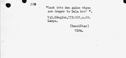 //// ^^ ^ ^Gack inte den galne vägen //// som drager te Dala kro' //// Vgl.LängjumyIII:235,s.69. //// Lampa. //// (Danslåtar) //// UIRA. //// ... * \ ////