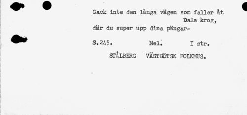//// ' Gäck inte den långa vägen som faller åt //// Dala krog, //// ! där du super upp dina pängar- //// S.245. Mel. I str. //// STÅLBERG VÄSTGÖTSK FOLK!€IS. //// H - H //// 9 //// } . . //// ! . ' ! ////