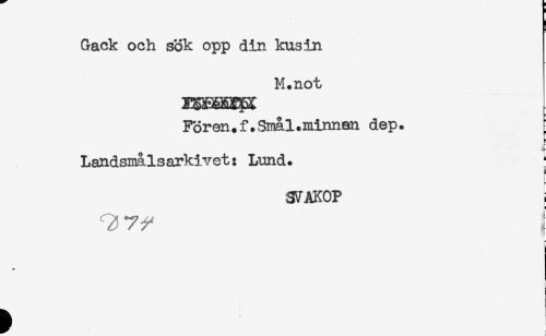 //// Gäck och sök opp din kusin //// M. not //// Fören.f. Snål. minnen dep. //// Landsmalsarkivet: Lund. //// c //// <0 //// r //// SVAKOP ; //// T! i //// F //// i ////