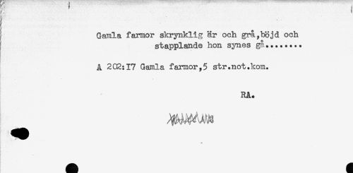 //// ! //// M. - //// r //// i Gamla farmor skrynklig är och grå,böjd och //// ' stapplande hon synes gå... //// A 202:17 Gamla farmor,5 str.not.kom. //// - - //// !)! //// RÅ. //// ** //// - ////
