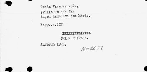 //// ^^ Gamla farmors kråka //// skulle ut och åka //// ingen hade hon som körde. //// T //// ! //// Vaggv.s.307 //// gHAin folletro. //// Augerum 1926. ////