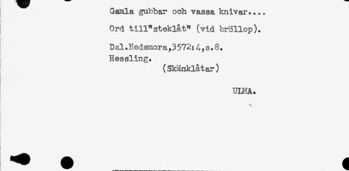 //// Gamla guobar och vassa knivar.... //// Ord till"steklåt" (vid bröllop). //// Dal.Hedemora,3 572:4,s.8. //// Hessling. //// (Skänklåtar) //// UU-IA. ////