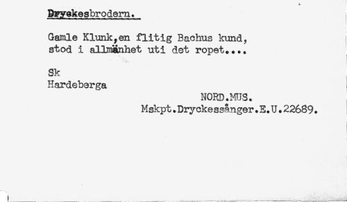 //// Gamle Klunk,en flitig Bachus kund, //// stod i allmänhet uti det ropet.... //// Sk //// Hardeberga //// NCRD.MIS. //// Mskpt. Dry eke ssånger. E. U. 22689. //// L.......-......-^. ////
