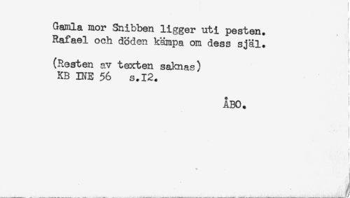 //// Gamla mor Snibben ligger uti pesten. //// Rafael och döden kämpa om dess själ. //// * //// (Resten av texten saknas) //// KB INE 56 s.I2. ; //// c //// ÅBO. ////