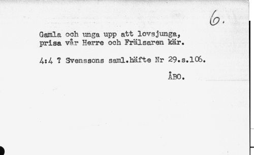 //// Gamla och unga upp att lovsjunga, //// prisa vår Herre och Frälsaren kär. //// ? Svenssons saml.häfte Nr 29.s.106. //// ÅBO. ////