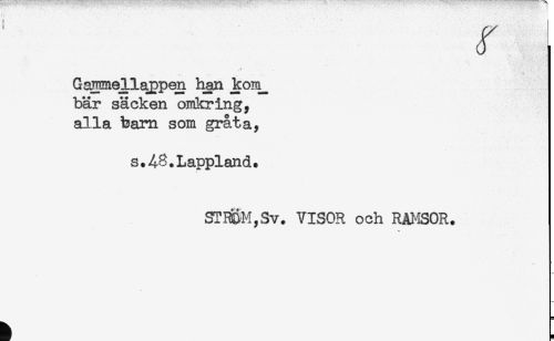 //// f //// * //// Gammellajppen han korn^ //// bär säcken omkring, //// alla bam som gråta, //// s.48.Lappland. //// STRÖM,Sv. VISOR och RAMSOR. ////