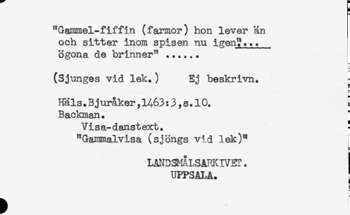 //// ^Gammel-fiffin (farmor) hon lever än //// och sitter inom spisen nu laen?... //// ögona de brinner" ...... //// (Sjunges vid lek.) Ej beskrivn. ^ //// Häls. B juråker, 1463: 3, s. 10. . //// Backman. //// Visa-danstext. ! //// ^Gammalvisa (sjöngs vid lek)" //// LANDSMÄLSARKIVET. //// UPPSALA. //// F ////