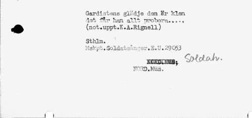 //// Gardistens glädje den är klen //// I det får han allt probera..... //// ^^ (not.uppt.K.A.Rignell) //// L //// St him. ' //// M skpt. Soldat sånger. E. U. 29 053 //// KBED^BSS: - ''- //// NORD.Mus. //// A //// ___' !___ ! ////