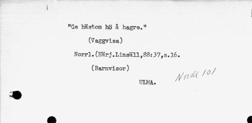//// i . - , //// i //// "Ge hästom hö å hagre." //// (Vaggvisa) //// Norrl.(Härj.Linsäll,88:37,s.16. //// . //// (Barnvisor) , ^ //// /ULMA. ^ //// f * //// T ////
